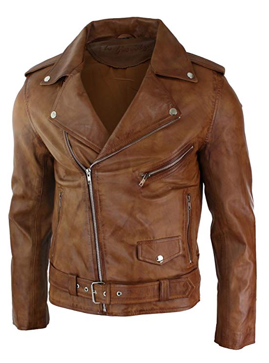 Men Slim Fit Cross Zip Retro Vintage Tan Brown Biker Rock Real Leather Jacket